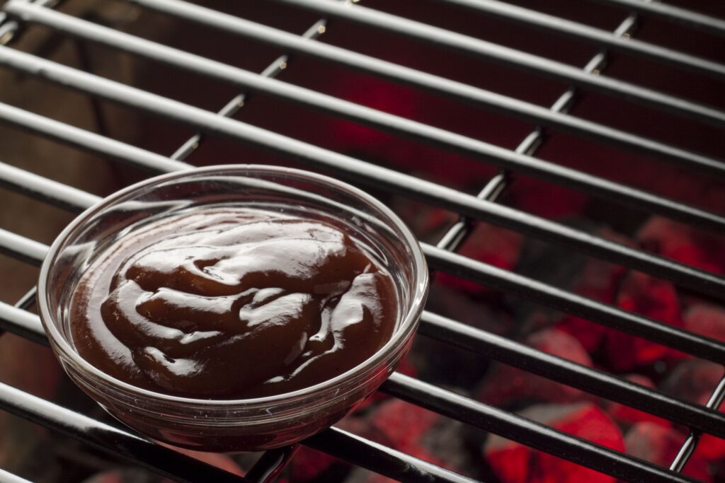 La salsa BBQ tiene una base similar al ketchup que generalmente se complementa con muchas especias y un toque de sabor ahumado. Está destinado a aplicarse con brocha sobre los alimentos antes de asarlos a la parrilla para mantener los productos húmedos y retener el sabor, pero también es delicioso como salsa para mojar o agregar a las guarniciones. El ingrediente principal de la salsa BBQ, los tomates, contienen una gran cantidad de propiedades antioxidantes y antiinflamatorias.